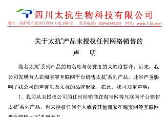關(guān)于太抗?產(chǎn)品未授權(quán)任何網(wǎng)絡(luò)銷售的聲明發(fā)布日期:2017.05.15點(diǎn)擊量:6613