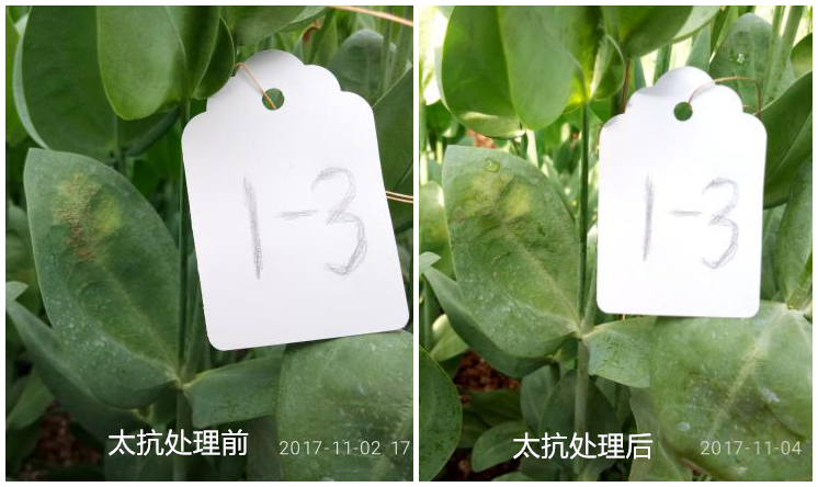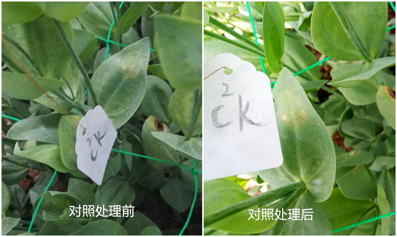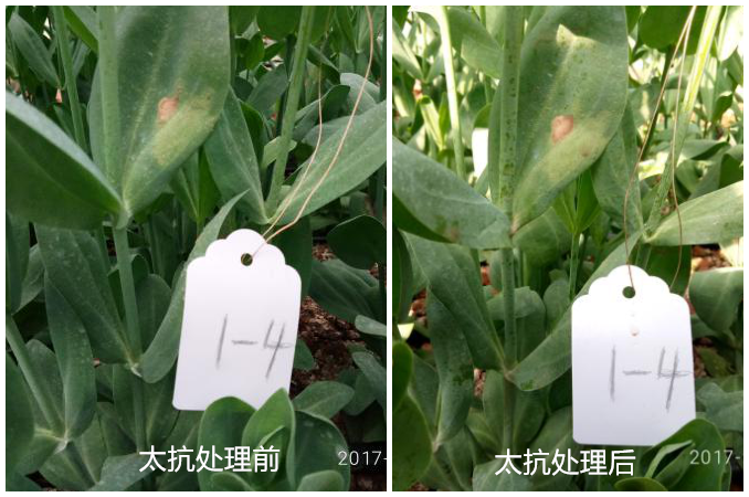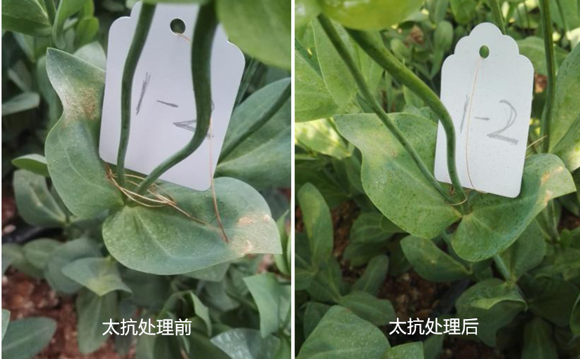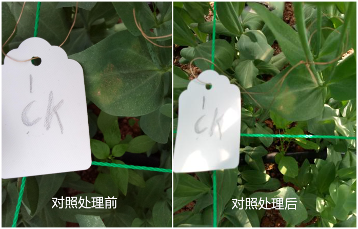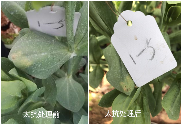 試驗(yàn)結(jié)果:太抗幾?。久快`能有效防治洋桔?;颐共?,使灰色霉層變干脫落。對照組仍有部分病斑沒有得到有效控制。